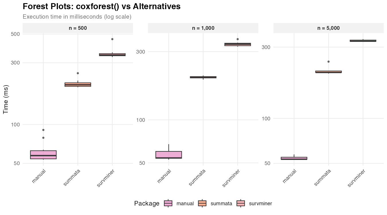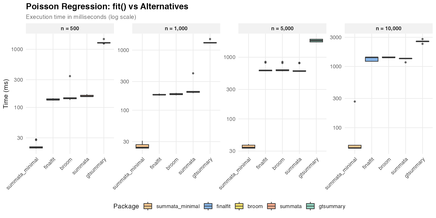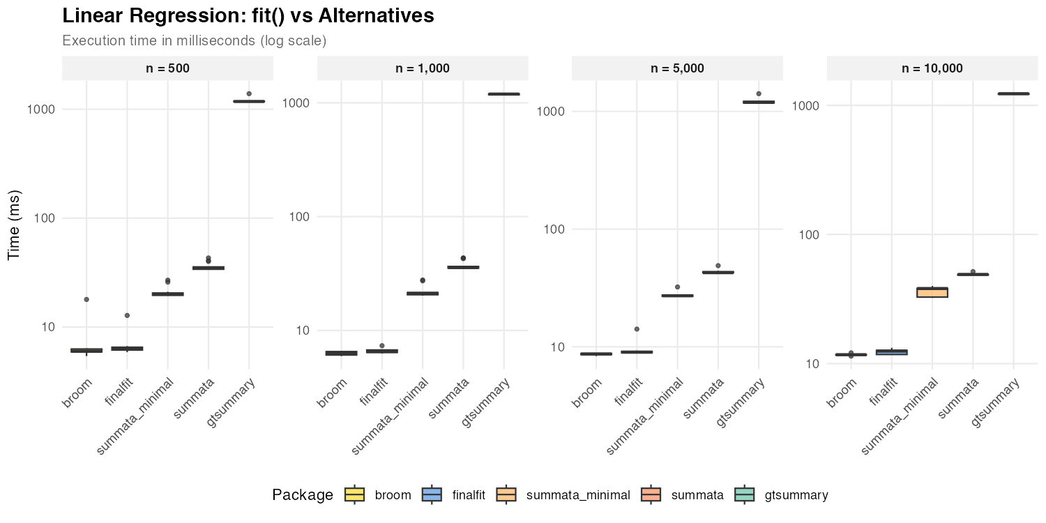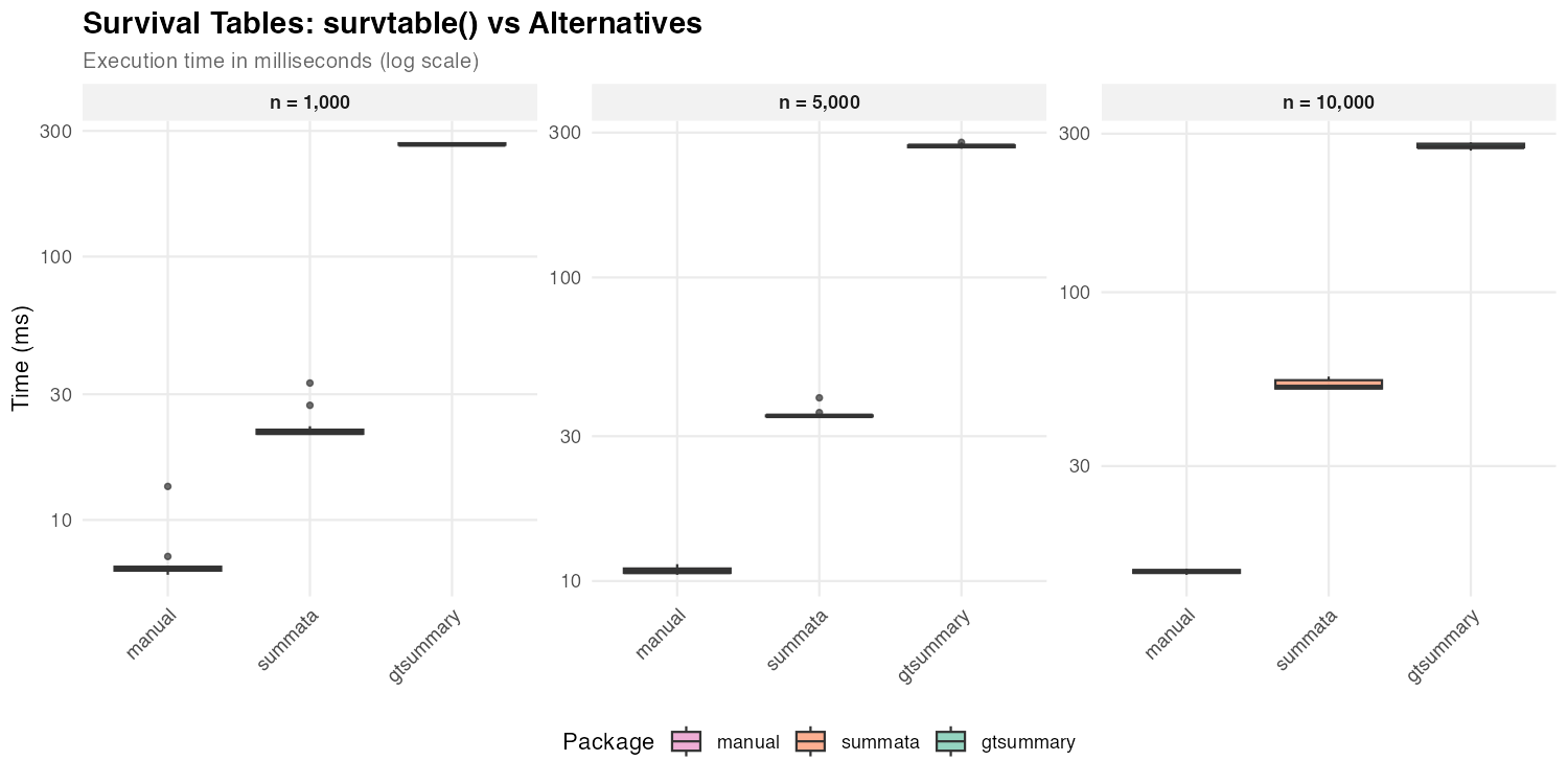 Datasets were generated using a fixed random seed to ensure reproducibility. Timing measurements exclude package loading and data generation. All packages were tested using default parameters unless otherwise noted.