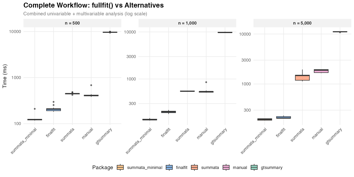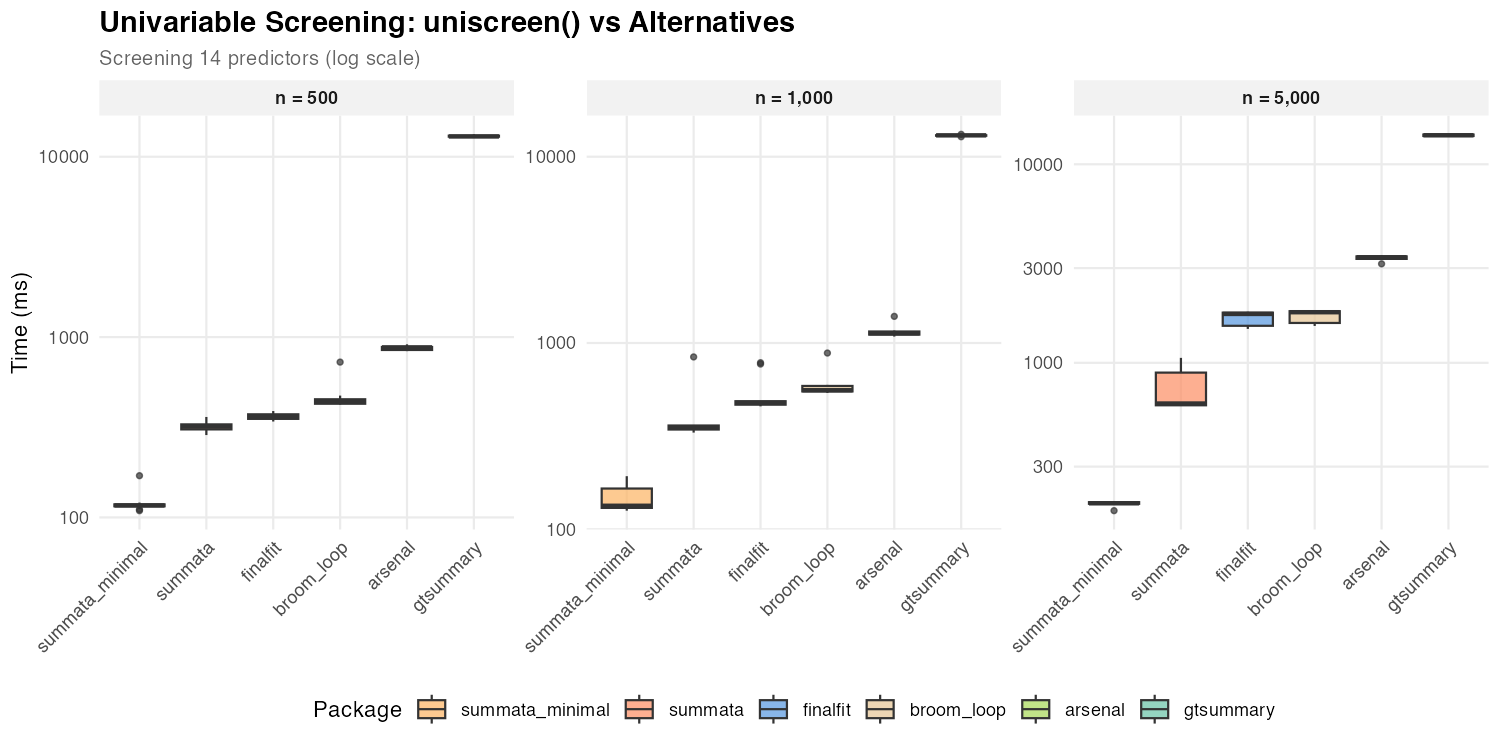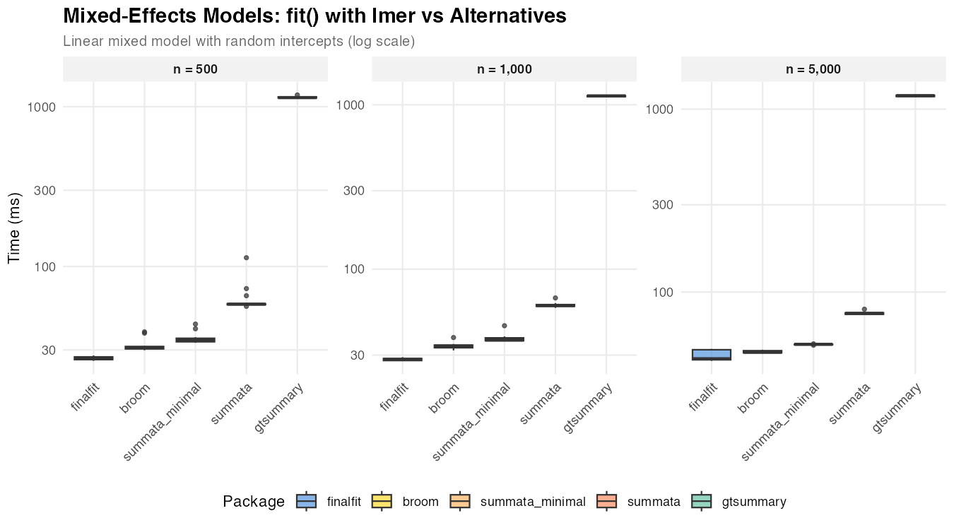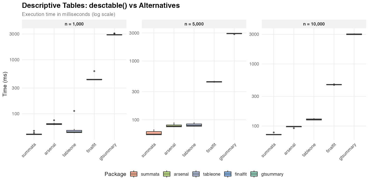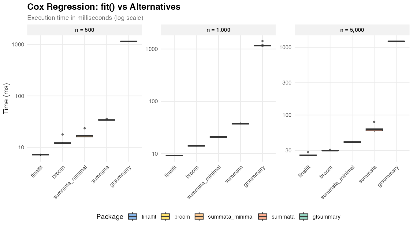 Datasets were generated using a fixed random seed to ensure reproducibility. Timing measurements exclude package loading and data generation. All packages were tested using default parameters unless otherwise noted.