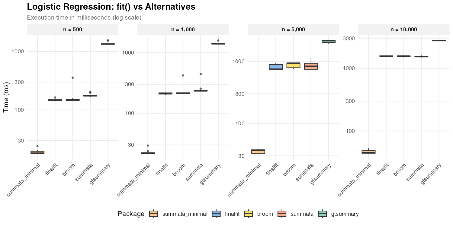 The sublinear scaling reflects that fixed overhead (package loading, object construction, profile likelihood profiling) constitutes a significant fraction of total time at smaller dataset sizes. Logistic regression shows nearer-to-linear scaling because profile likelihood profiling cost scales with the number of IRLS iterations, which grows with n.