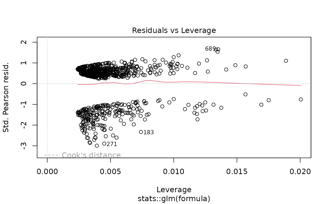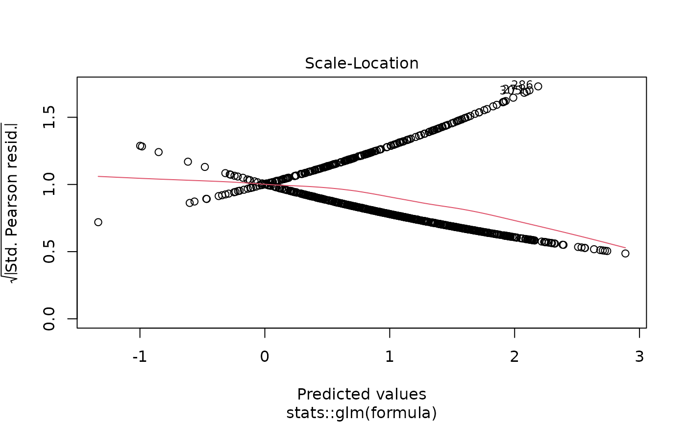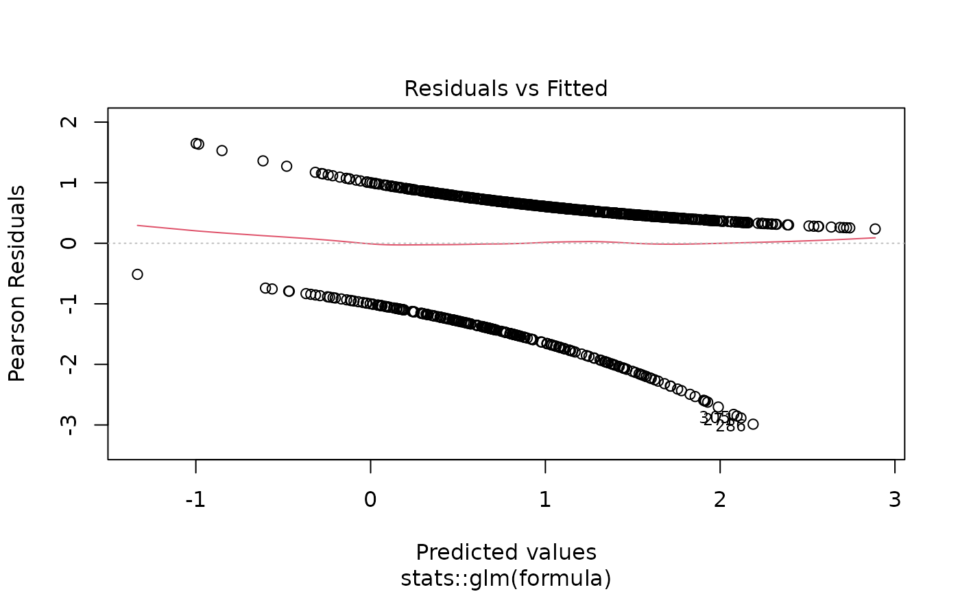 "binomial"orbinomial()- Logistic regression for binary outcomes (0/1, TRUE/FALSE). Returns odds ratios (OR). Default."quasibinomial"orquasibinomial()- Logistic regression with overdispersion. Use when residual deviance >> residual df.binomial(link = "probit")- Probit regression (normal CDF link).binomial(link = "cloglog")- Complementary log-log link for asymmetric binary outcomes.